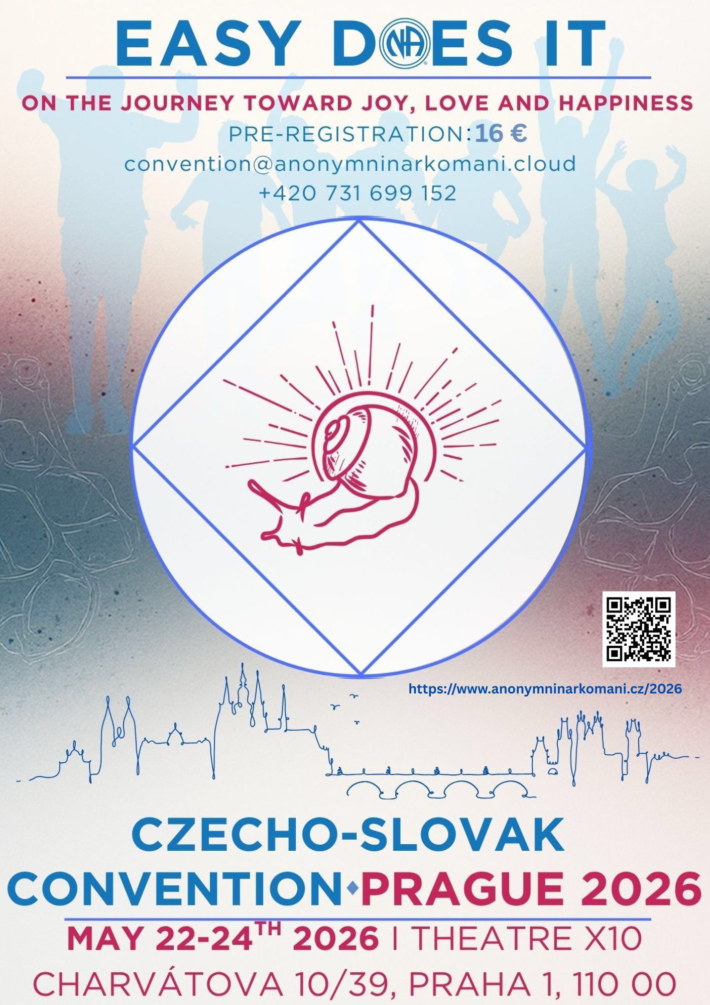 wir laden Sie zum bevorstehenden tschechisch-slowakischen Kongress von Narcotics Anonymous ein, der von Freitag, 22. Mai, bis Sonntag, 24. Mai 2026 in Prag stattfinden wird!